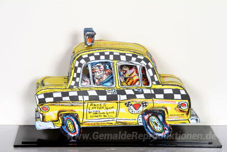 Wir bieten Ihnen eine handgefertigte Reproduktion auf Leinwand des berühmten Kunstwerks 'Ruckus Taxi' von Red Grooms, aus dem Reproduktionsmuseum.