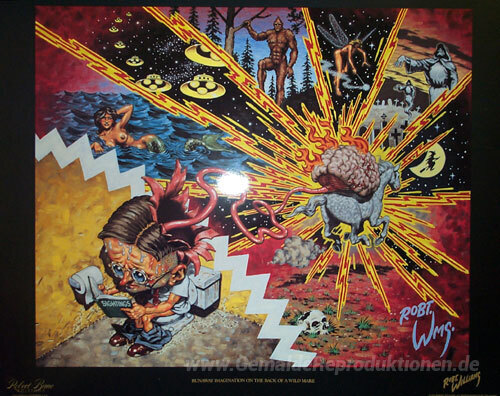 Wir bieten Ihnen eine handgefertigte Reproduktion auf Leinwand des berühmten Kunstwerks 'Runaway Imagination auf der Rückseite von einem Wild Mare' von Robert Williams, aus dem Reproduktionsmuseum.