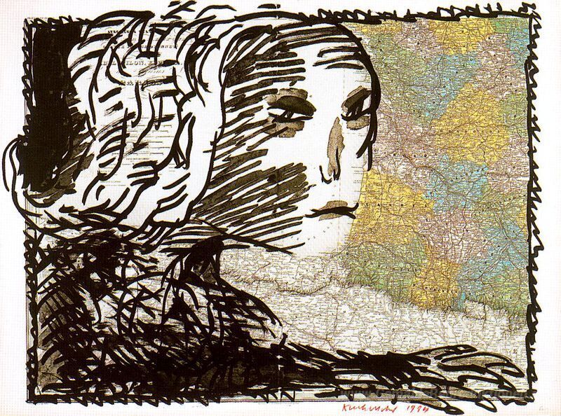Wir bieten Ihnen eine handgefertigte Reproduktion auf Leinwand des berühmten Kunstwerks 'Seite der Universalatlas, II. Golf von Biskaya' von Pierre Alechinsky, aus dem Reproduktionsmuseum.