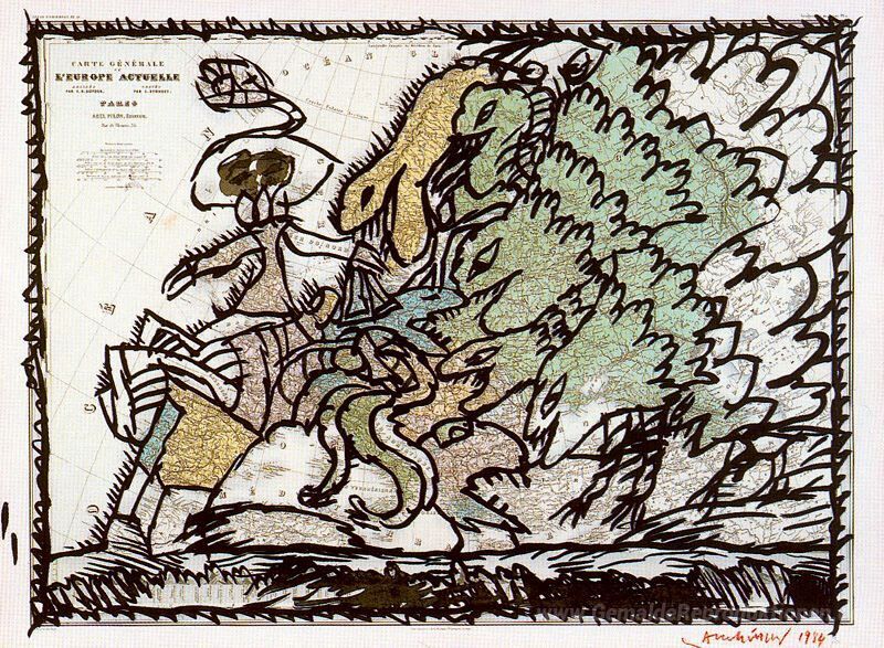 Wir bieten Ihnen eine handgefertigte Reproduktion auf Leinwand des berühmten Kunstwerks 'Seite der Universalatlas, VI. Europa von heute' von Pierre Alechinsky, aus dem Reproduktionsmuseum.