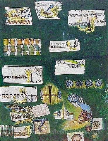 Wir bieten Ihnen eine handgefertigte Reproduktion auf Leinwand des berühmten Kunstwerks 'Skogsspår (Trail of Prints in the Woods)' von Oyvind Fahlstrom, aus dem Reproduktionsmuseum.