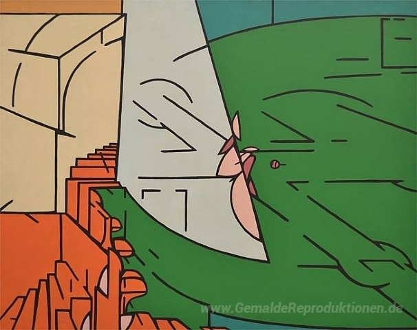 Wir bieten Ihnen eine handgefertigte Reproduktion auf Leinwand des berühmten Kunstwerks 'Spettacolo all'aperto' von Valerio Adami, aus dem Reproduktionsmuseum.