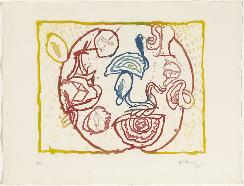 Wir bieten Ihnen eine handgefertigte Reproduktion auf Leinwand des berühmten Kunstwerks 'Sterne und Katastrophe (Astres et Desastres)' von Pierre Alechinsky, aus dem Reproduktionsmuseum.