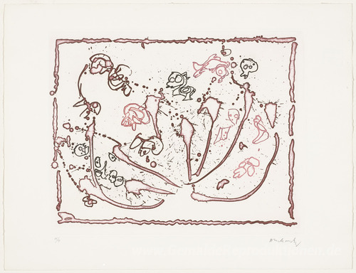 Wir bieten Ihnen eine handgefertigte Reproduktion auf Leinwand des berühmten Kunstwerks 'Untitled von der Test der Titel (Le-Test du titre)' von Pierre Alechinsky, aus dem Reproduktionsmuseum.