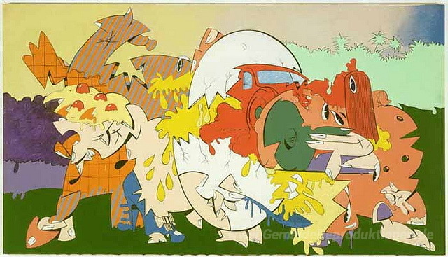 Wir bieten Ihnen eine handgefertigte Reproduktion auf Leinwand des berühmten Kunstwerks 'Uovo Rotto Coll' von Valerio Adami, aus dem Reproduktionsmuseum.