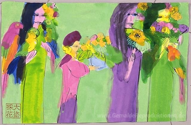 Wir bieten Ihnen eine handgefertigte Reproduktion auf Leinwand des berühmten Kunstwerks 'Versuchen wir es mit Blumen' von Walasse Ting, aus dem Reproduktionsmuseum.