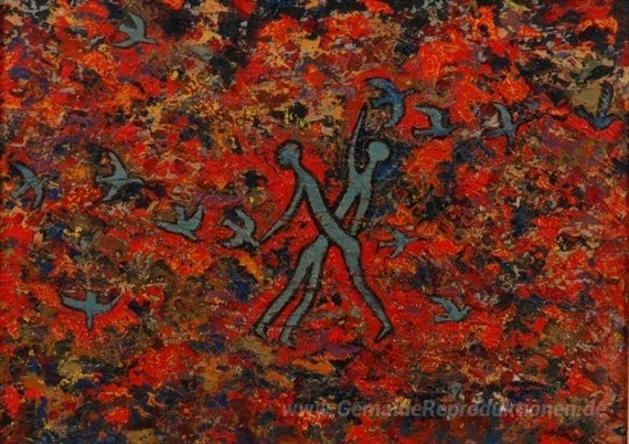 Wir bieten Ihnen eine handgefertigte Reproduktion auf Leinwand des berühmten Kunstwerks 'Zwei Figuren spielen mit Vögeln' von Walter Battiss, aus dem Reproduktionsmuseum.