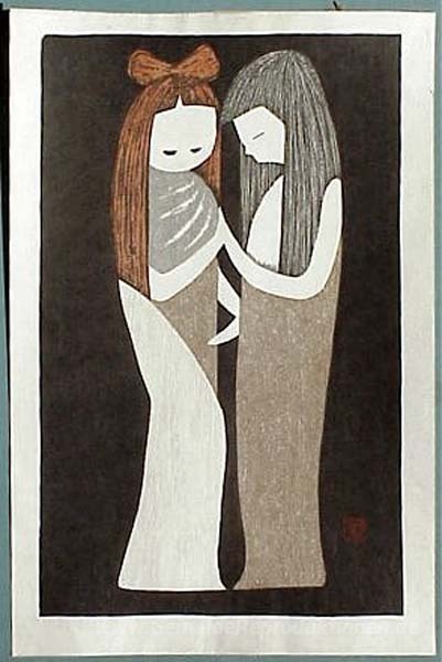 Wir bieten Ihnen eine handgefertigte Reproduktion auf Leinwand des berühmten Kunstwerks 'Zwei Mädchen' von Kaoru Kawano, aus dem Reproduktionsmuseum.