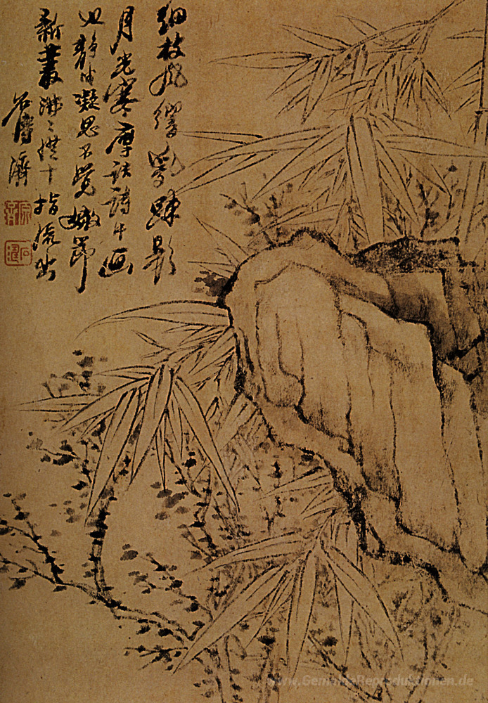 Wir bieten Ihnen eine handgefertigte Reproduktion auf Leinwand des berühmten Kunstwerks 'Bambus und Felsen' von Shitao, aus dem Reproduktionsmuseum.
