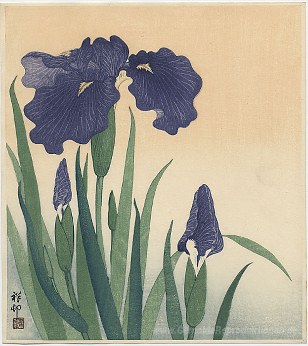 Wir bieten Ihnen eine handgefertigte Reproduktion auf Leinwand des berühmten Kunstwerks 'Blühende Iris' von Ohara Koson, aus dem Reproduktionsmuseum.