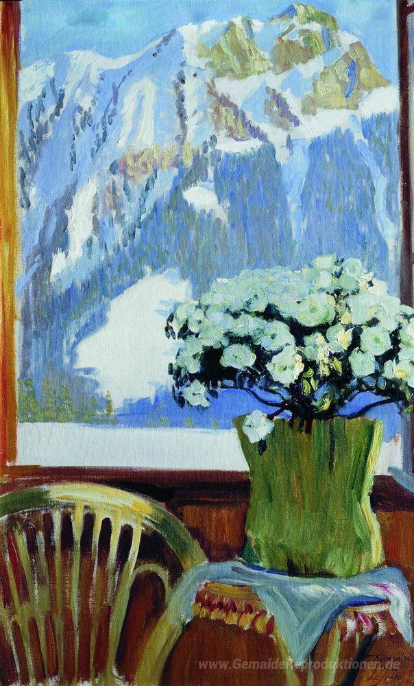 Wir bieten Ihnen eine handgefertigte Reproduktion auf Leinwand des berühmten Kunstwerks 'Blumen auf dem Balkon' von Boris Kustodiev, aus dem Reproduktionsmuseum.