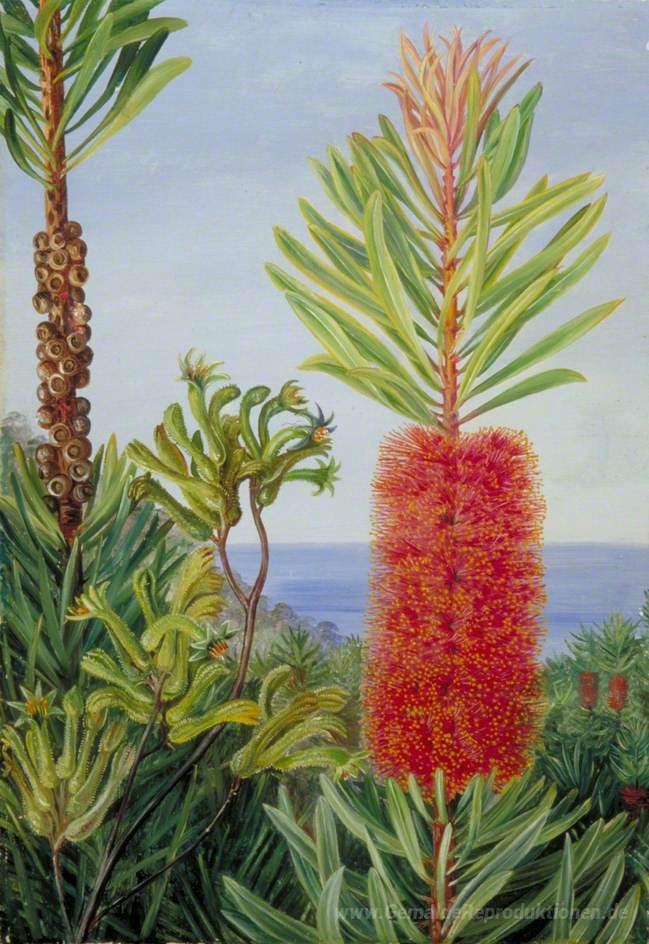Willkommen in der faszinierenden Welt der Ölgemälde! Hier präsentieren wir Ihnen exquisite Werke, die nicht nur ästhetischen Genuss, sondern auch kreative Inspiration bieten. Eines der herausragenden Kunstwerke in unserer Sammlung ist „Blumen von einem West Australian Kangaroo Strauch und Füße“, meisterhaft geschaffen von der talentierten Künstlerin Marianne North. Bekannt für ihre detailreichen Darstellungen der Natur, kombiniert North in diesem Bild leidenschaftlich botanische Präzision mit einer lebendigen Farbpalette.
