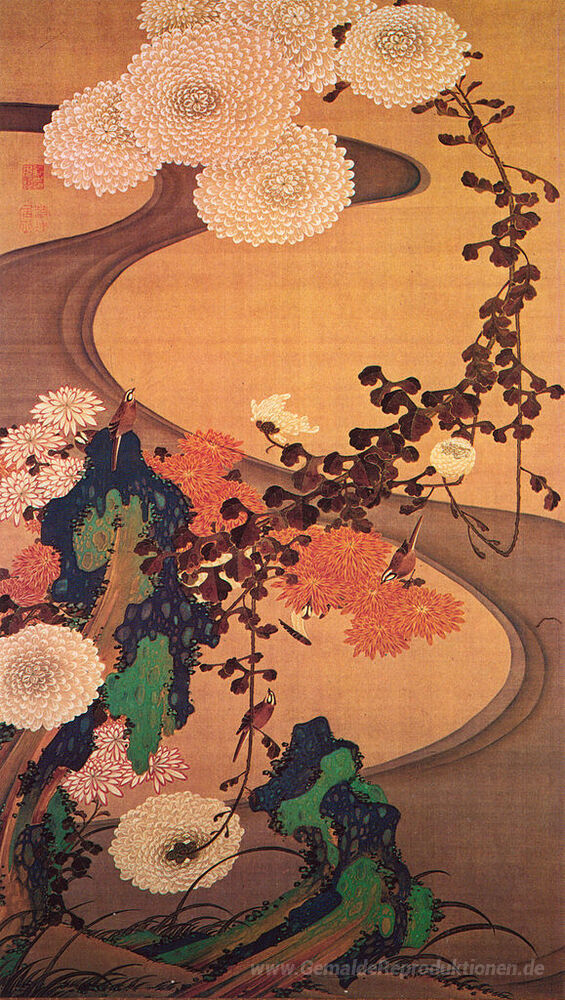 Wir bieten Ihnen eine handgefertigte Reproduktion auf Leinwand des berühmten Kunstwerks 'Chrysanthemen durch einen Strom, mit Steinen' von Ito Jakuchu, aus dem Reproduktionsmuseum.