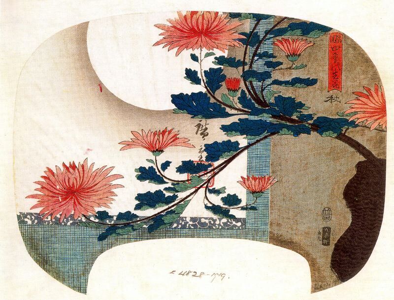 Wir bieten Ihnen eine handgefertigte Reproduktion auf Leinwand des berühmten Kunstwerks 'Chrysanthemen' von Hiroshige, aus dem Reproduktionsmuseum.