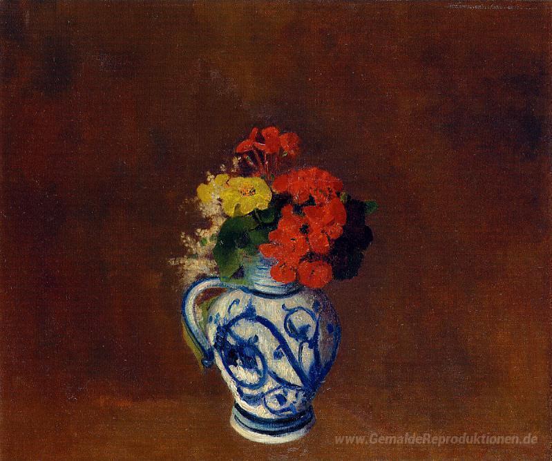 Wir bieten Ihnen eine handgefertigte Reproduktion auf Leinwand des berühmten Kunstwerks 'Geranien und andere Blumen in einer Vase aus Steinzeug' von Odilon Redon, aus dem Reproduktionsmuseum.