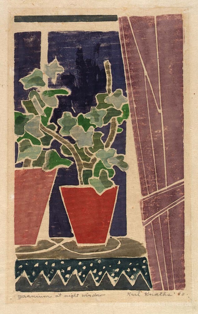 Wir bieten Ihnen eine handgefertigte Reproduktion auf Leinwand des berühmten Kunstwerks 'Geranium nachts Fenster' von Karl Knaths, aus dem Reproduktionsmuseum.