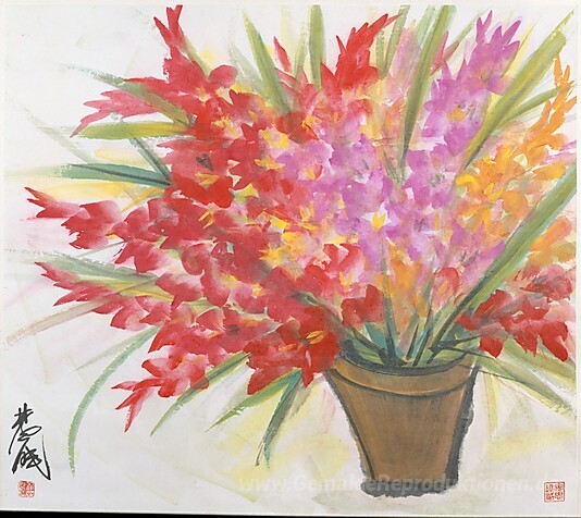 Wir bieten Ihnen eine handgefertigte Reproduktion auf Leinwand des berühmten Kunstwerks 'Gladiolen' von Lin Fengmian, aus dem Reproduktionsmuseum.