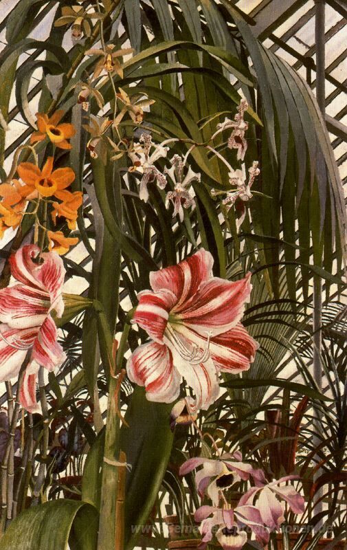 Wir bieten Ihnen eine handgefertigte Reproduktion auf Leinwand des berühmten Kunstwerks 'Orchideen, Lilien, Palms' von Stanley Spencer, aus dem Reproduktionsmuseum.