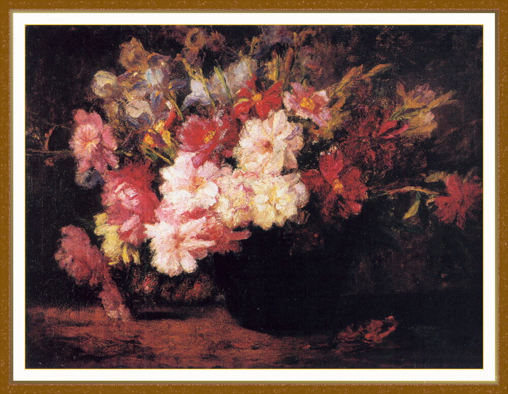 Wir bieten Ihnen eine handgefertigte Reproduktion auf Leinwand des berühmten Kunstwerks 'Pfingstrosen und Iris' von T. C. Steele, aus dem Reproduktionsmuseum.