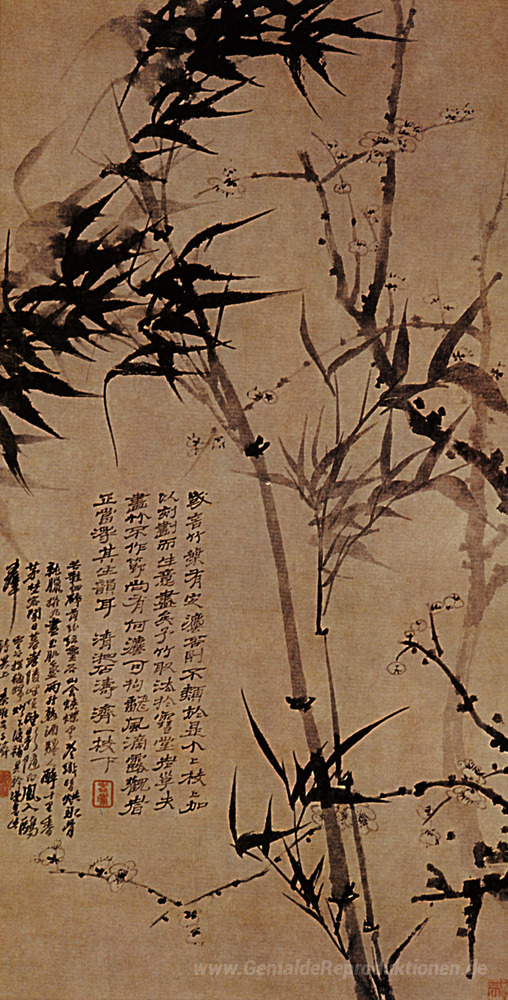Wir bieten Ihnen eine handgefertigte Reproduktion auf Leinwand des berühmten Kunstwerks 'Prunus in Blüte und Bambus' von Shitao, aus dem Reproduktionsmuseum.