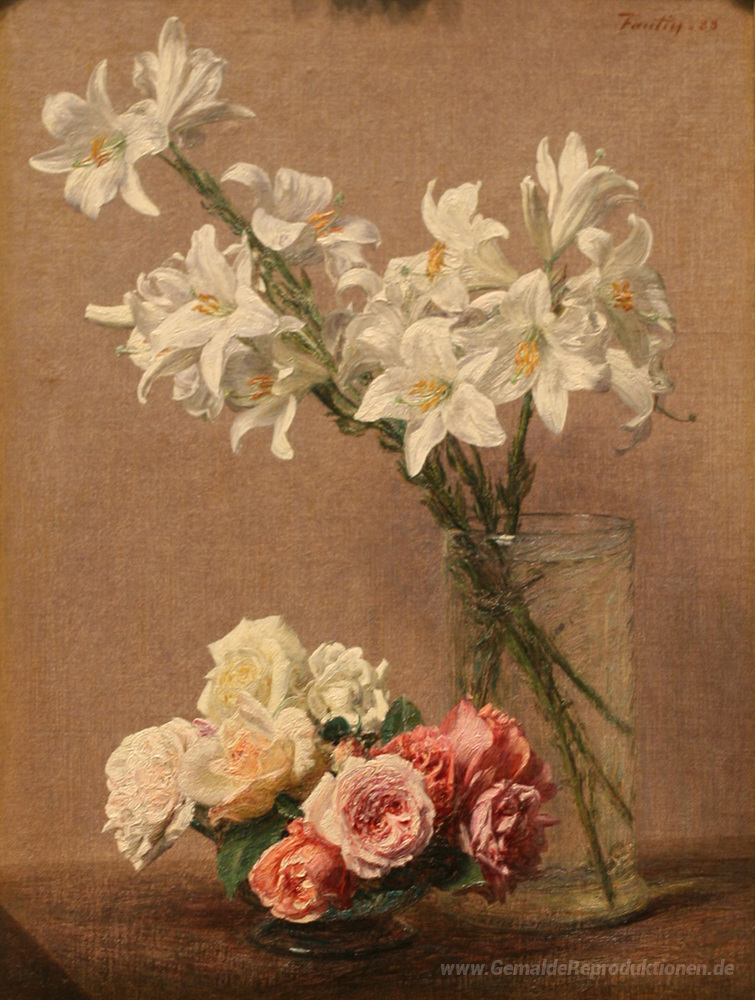 Wir bieten Ihnen eine handgefertigte Reproduktion auf Leinwand des berühmten Kunstwerks 'Rosen und Lilien' von Henri Fantin-Latour, aus dem Reproduktionsmuseum.