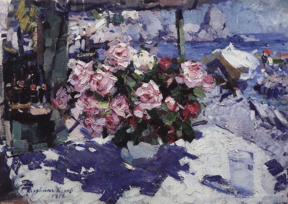 Wir bieten Ihnen eine handgefertigte Reproduktion auf Leinwand des berühmten Kunstwerks 'Roses' von Konstantin Korovin, aus dem Reproduktionsmuseum.