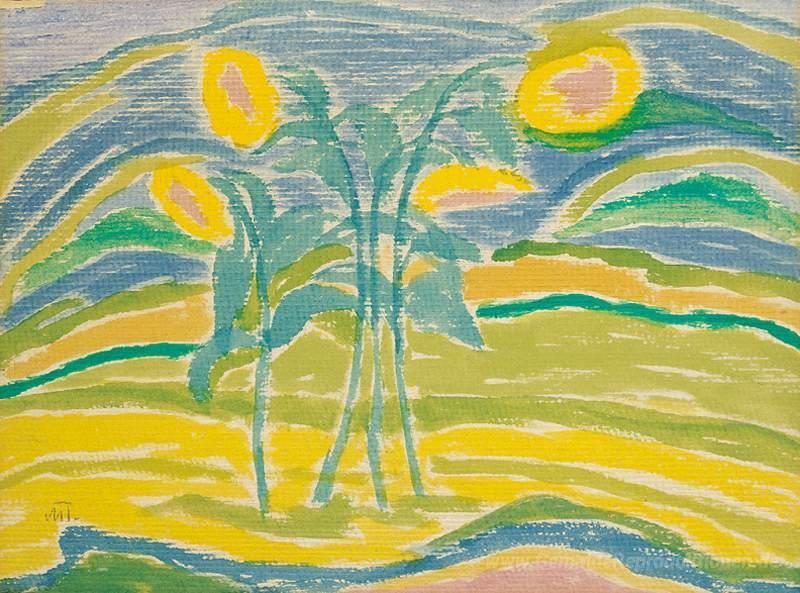 Wir bieten Ihnen eine handgefertigte Reproduktion auf Leinwand des berühmten Kunstwerks 'Sonnenblumen' von Janos Mattis-Teutsch, aus dem Reproduktionsmuseum.