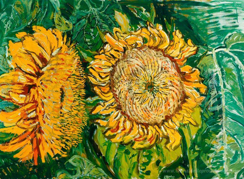 Wir bieten Ihnen eine handgefertigte Reproduktion auf Leinwand des berühmten Kunstwerks 'Sonnenblumen' von John Bratby, aus dem Reproduktionsmuseum.