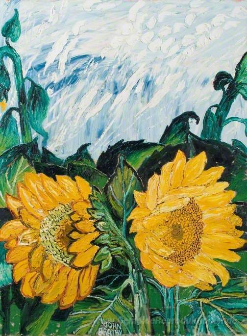 Wir bieten Ihnen eine handgefertigte Reproduktion auf Leinwand des berühmten Kunstwerks 'Sonnenblumen und Sun-Crossed Himmel im Sommer' von John Bratby, aus dem Reproduktionsmuseum.