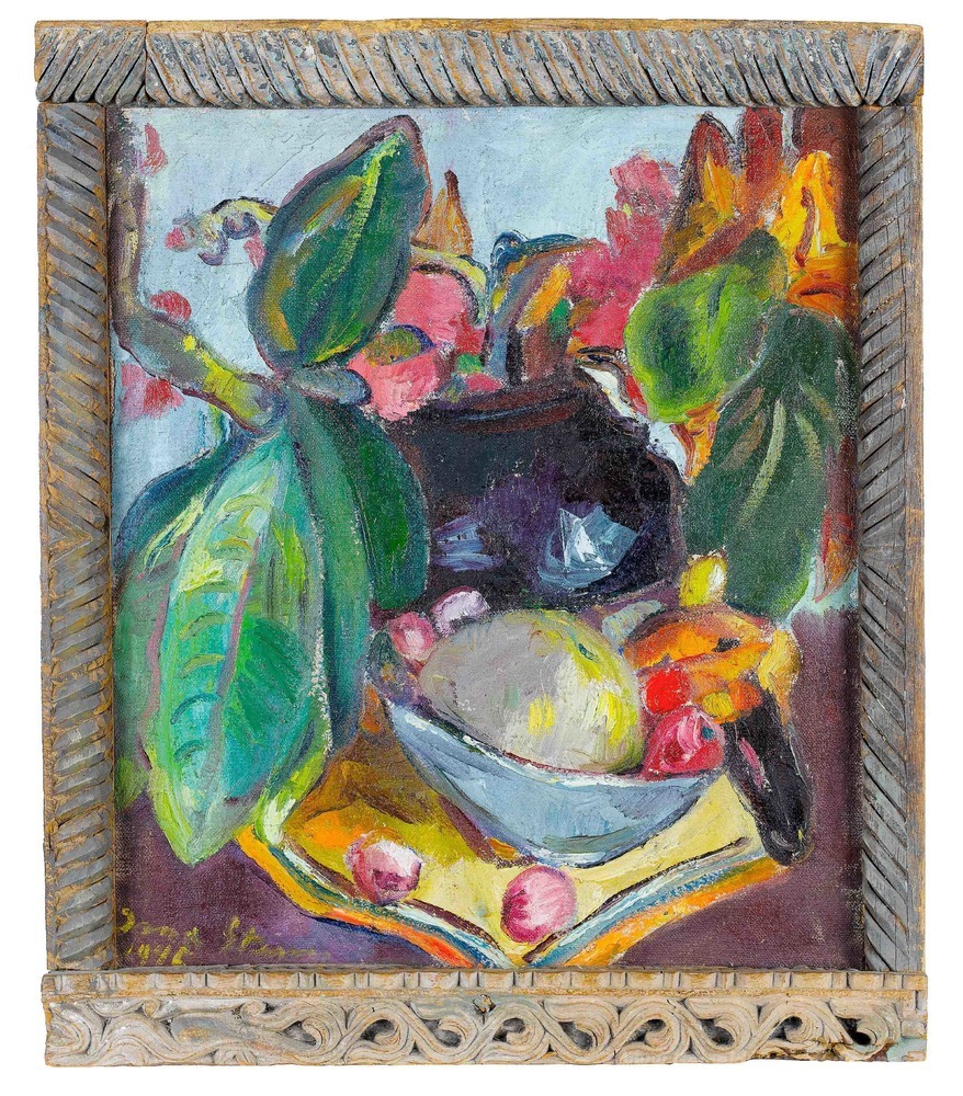 Wir bieten Ihnen eine handgefertigte Reproduktion auf Leinwand des berühmten Kunstwerks 'Stillleben mit Blättern, Früchten und Blumen' von Irma Stern, aus dem Reproduktionsmuseum.