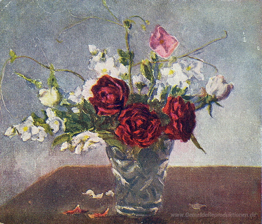 Wir bieten Ihnen eine handgefertigte Reproduktion auf Leinwand des berühmten Kunstwerks 'Stillleben. Rote Rosen.' von Pyotr Konchalovsky, aus dem Reproduktionsmuseum.