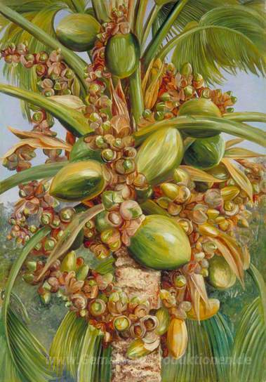 Wir bieten Ihnen eine handgefertigte Reproduktion auf Leinwand des berühmten Kunstwerks 'Weiblich Coco de Mer Früchte mit kleinen grünen Eidechsen Dachte' von Marianne North, aus dem Reproduktionsmuseum.