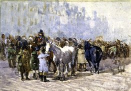 Landschaft mit einem Mann wäscht sich die Füße an einem Brunnen