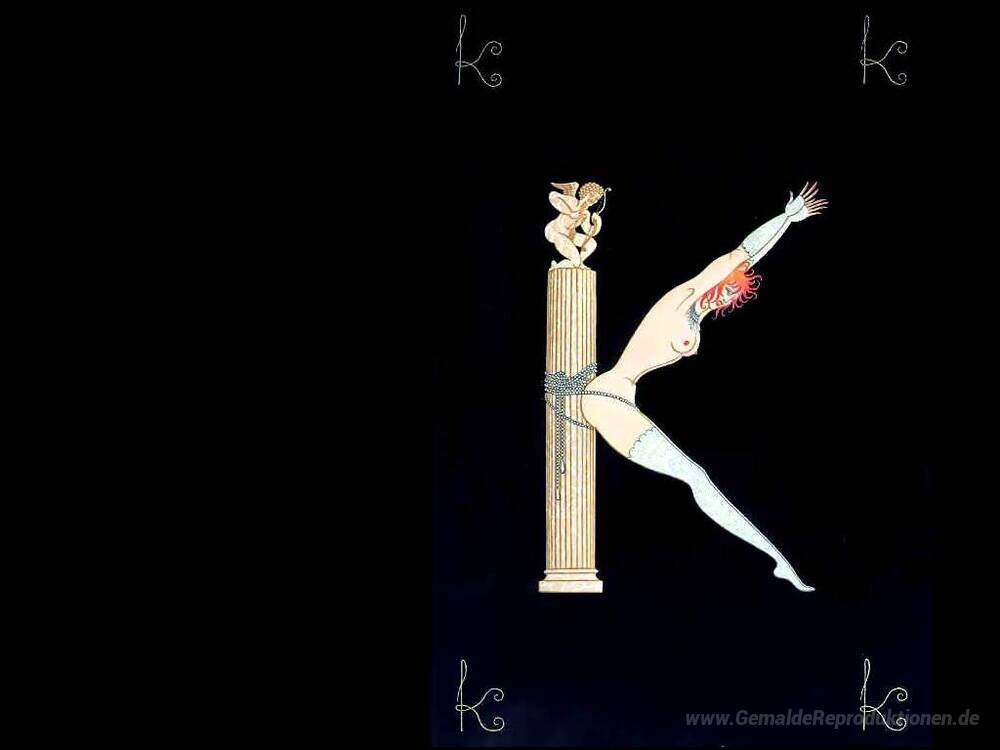 Wir bieten Ihnen eine handgefertigte Reproduktion auf Leinwand des berühmten Kunstwerks 'Alphabet K' von Erte, aus dem Reproduktionsmuseum.