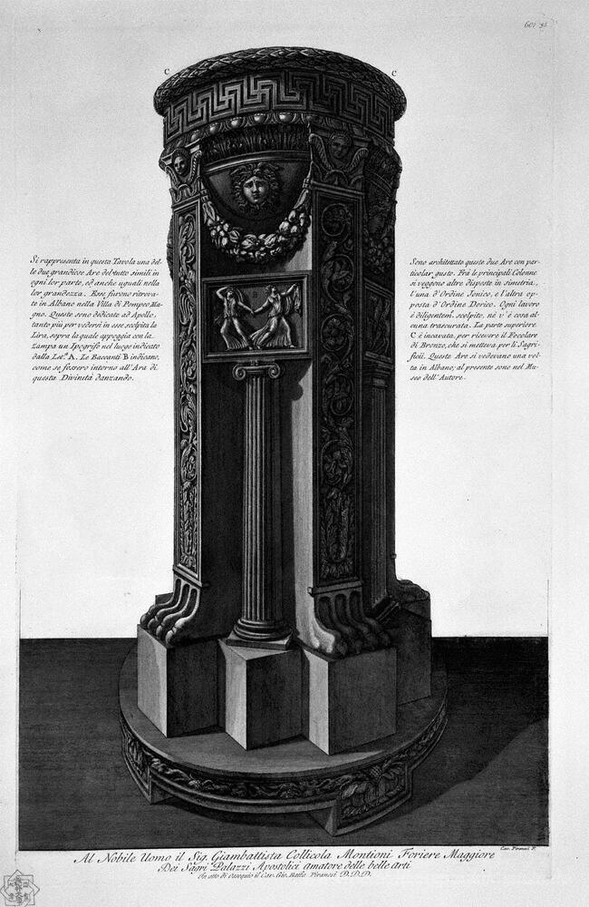 Wir bieten Ihnen eine handgefertigte Reproduktion auf Leinwand des berühmten Kunstwerks 'Altar, der Apollo gewidmet in der Villa des Pompejus der Große i' von Giovanni Battista Piranesi, aus dem Reproduktionsmuseum.
