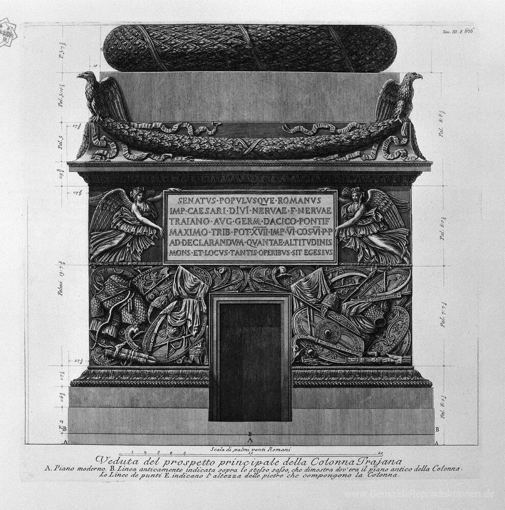 Wir bieten Ihnen eine handgefertigte Reproduktion auf Leinwand des berühmten Kunstwerks 'Ansicht der Hauptfassade der Trajanssäule, sechs Bretter zusamme' von Giovanni Battista Piranesi, aus dem Reproduktionsmuseum.