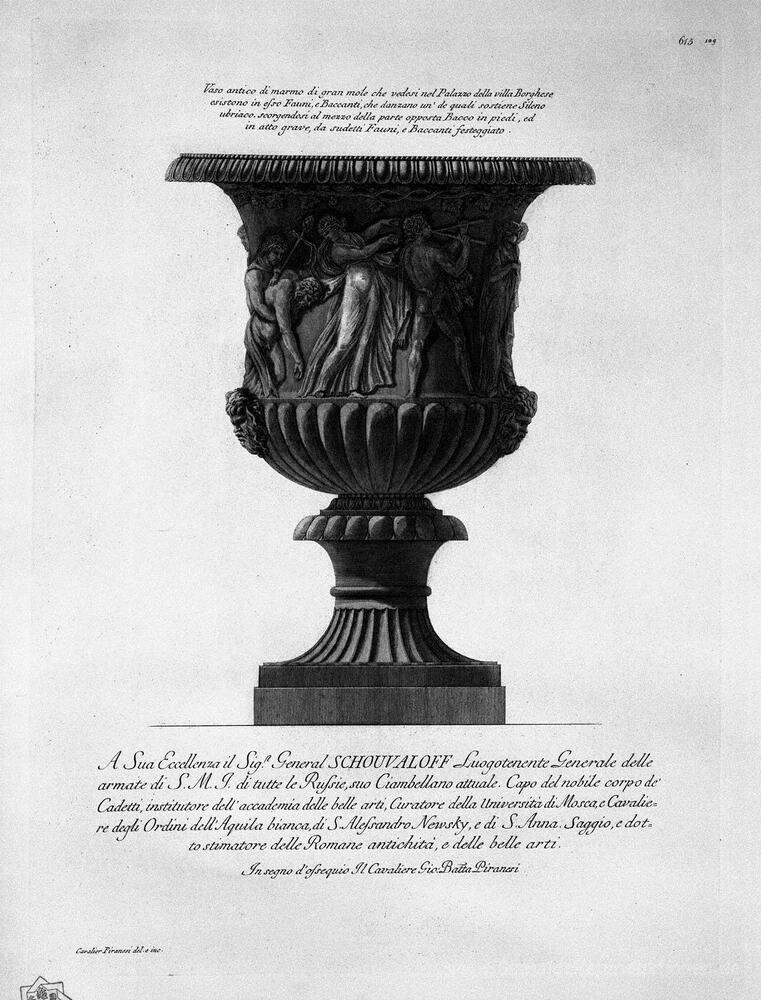 Wir bieten Ihnen eine handgefertigte Reproduktion auf Leinwand des berühmten Kunstwerks 'Antike Vase aus Marmor viel in den Palast der Villa Borghese' von Giovanni Battista Piranesi, aus dem Reproduktionsmuseum.
