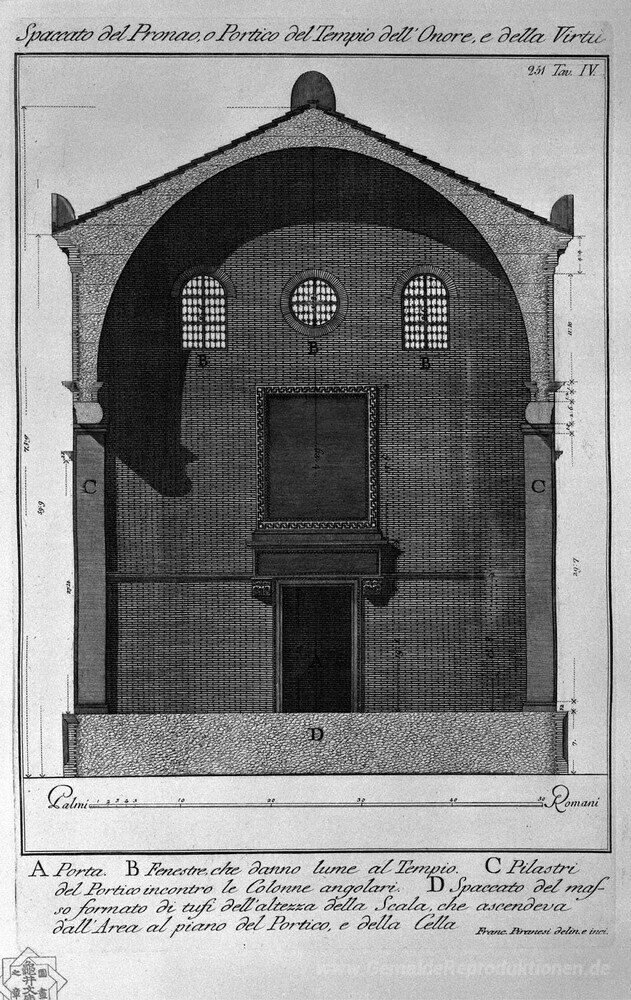 Wir bieten Ihnen eine handgefertigte Reproduktion auf Leinwand des berühmten Kunstwerks 'Aufgeschnittene Ansicht der Vorhalle oder Säulenhalle des Tempel' von Giovanni Battista Piranesi, aus dem Reproduktionsmuseum.
