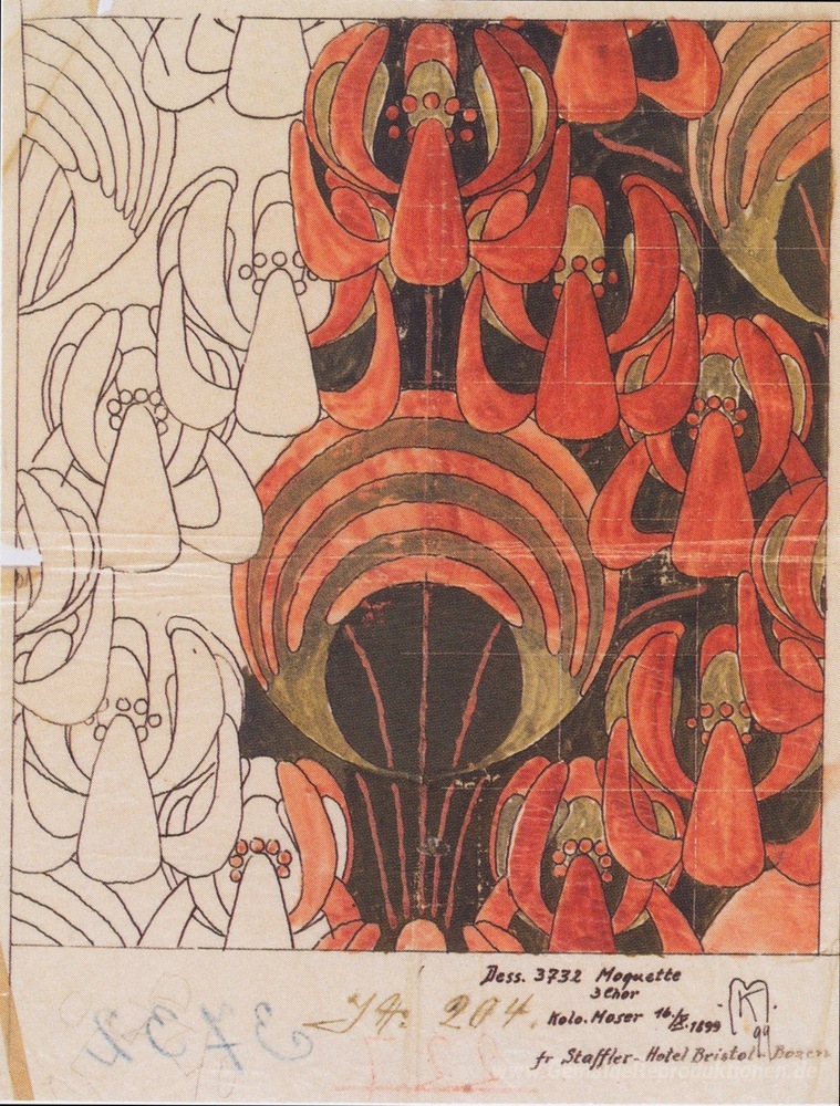 Wir bieten Ihnen eine handgefertigte Reproduktion auf Leinwand des berühmten Kunstwerks 'Backhausen Interior texiles für das Hotel Bristol in Bozen' von Koloman Moser, aus dem Reproduktionsmuseum.