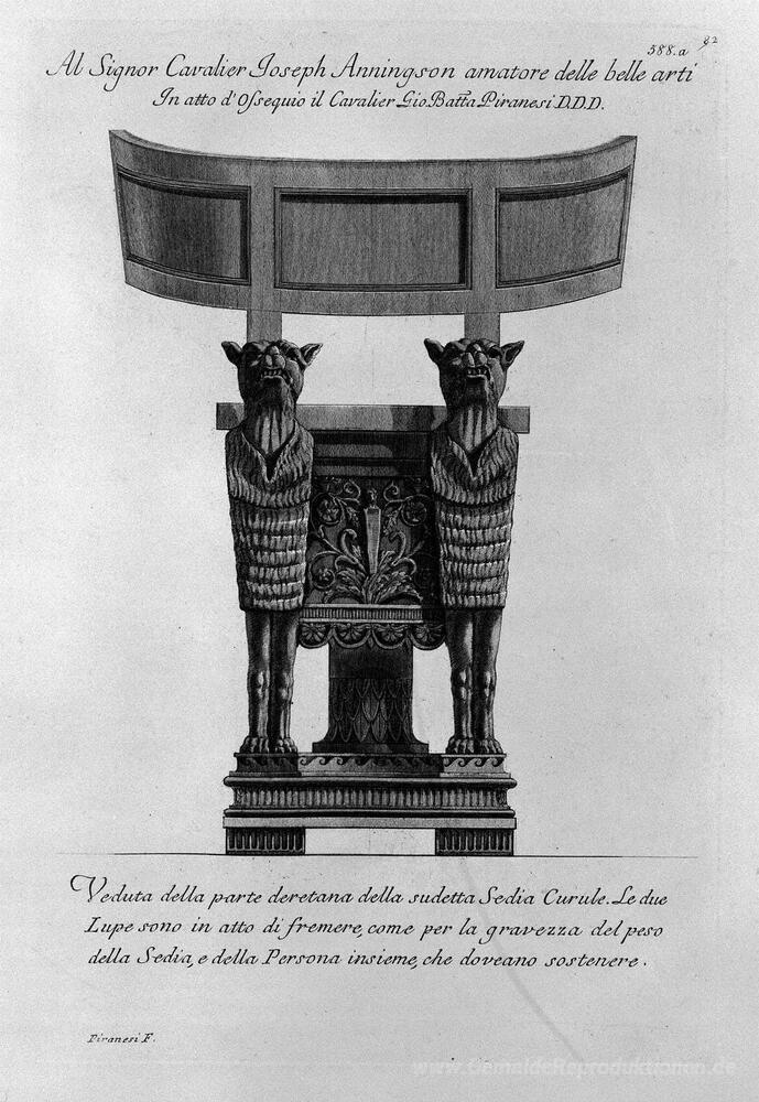 Wir bieten Ihnen eine handgefertigte Reproduktion auf Leinwand des berühmten Kunstwerks 'Blick von der Rückseite dieses kurulischen Stuhl' von Giovanni Battista Piranesi, aus dem Reproduktionsmuseum.