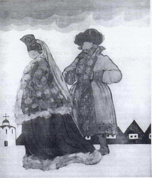 Wir bieten Ihnen eine handgefertigte Reproduktion auf Leinwand des berühmten Kunstwerks 'Boyarin und boyarynia' von Nicholas Roerich, aus dem Reproduktionsmuseum.