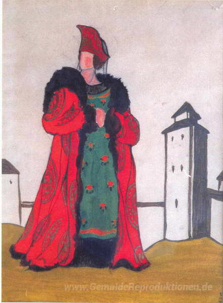 Wir bieten Ihnen eine handgefertigte Reproduktion auf Leinwand des berühmten Kunstwerks 'Boyarynia in rot' von Nicholas Roerich, aus dem Reproduktionsmuseum.