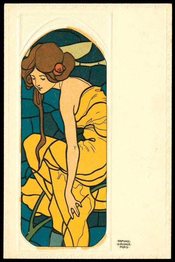 Wir bieten Ihnen eine handgefertigte Reproduktion auf Leinwand des berühmten Kunstwerks 'Buntglas-Kunst' von Raphael Kirchner, aus dem Reproduktionsmuseum.