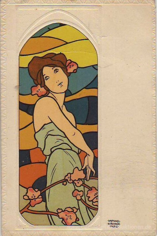 Wir bieten Ihnen eine handgefertigte Reproduktion auf Leinwand des berühmten Kunstwerks 'Buntglas-Kunst' von Raphael Kirchner, aus dem Reproduktionsmuseum.