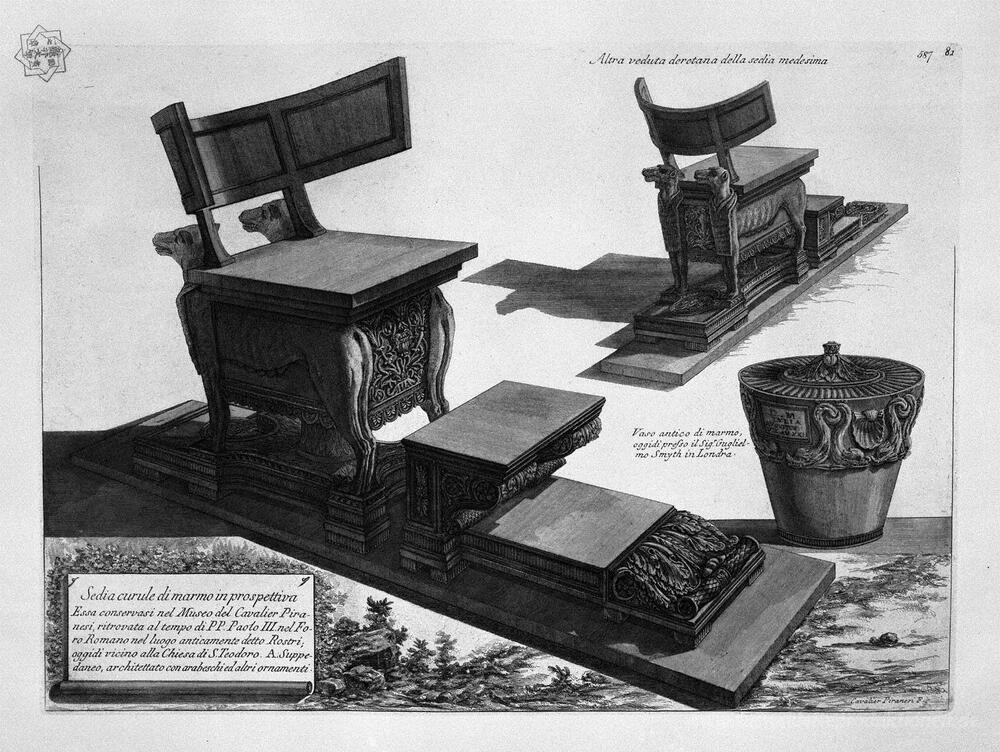 Wir bieten Ihnen eine handgefertigte Reproduktion auf Leinwand des berühmten Kunstwerks 'Curule Stuhl aus Marmor auf der Rostra auf dem Forum Romanum gef' von Giovanni Battista Piranesi, aus dem Reproduktionsmuseum.