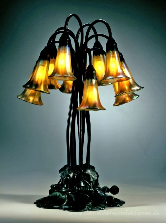 Wir bieten Ihnen eine handgefertigte Reproduktion auf Leinwand des berühmten Kunstwerks 'Dekorative Lampe. Pond Lily Design' von Louis Comfort Tiffany, aus dem Reproduktionsmuseum.