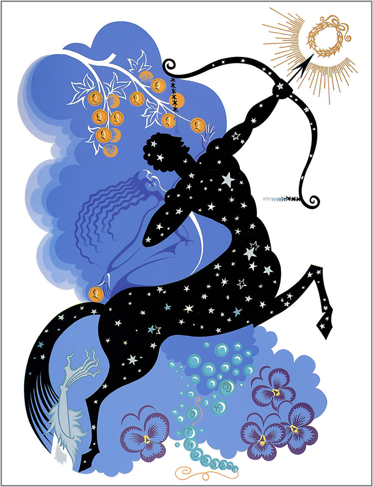 Wir bieten Ihnen eine handgefertigte Reproduktion auf Leinwand des berühmten Kunstwerks 'Der Tierkreis, Schütze' von Erte, aus dem Reproduktionsmuseum.