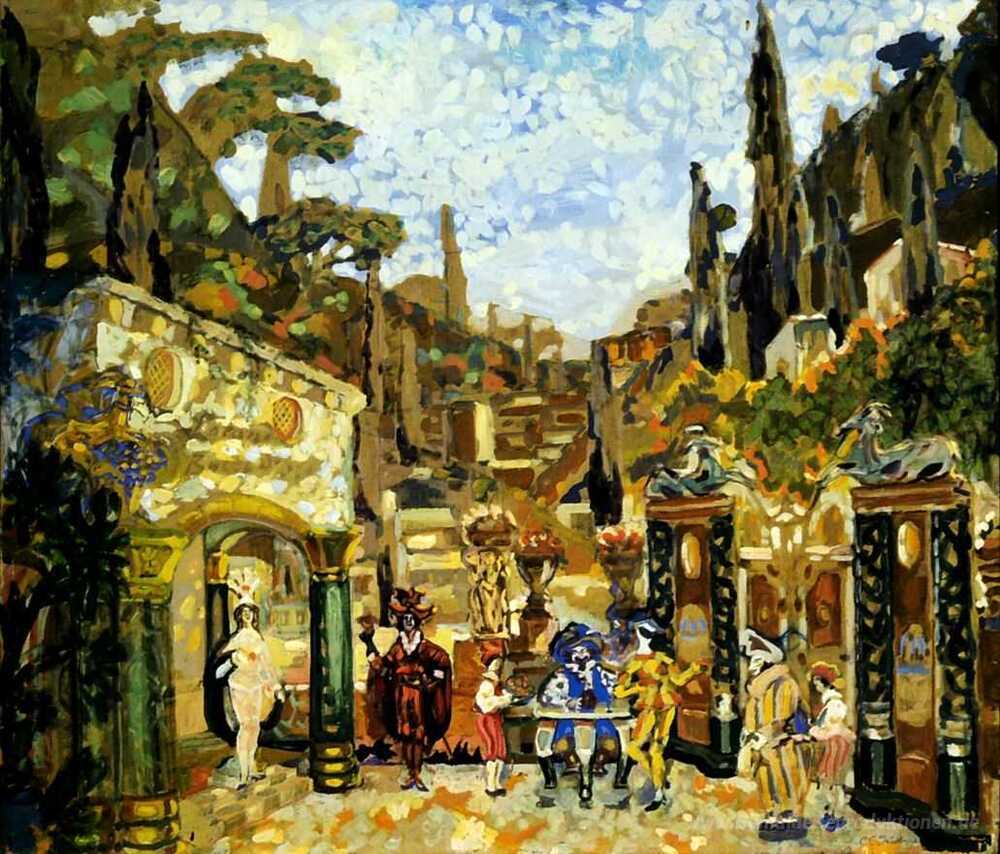 Wir bieten Ihnen eine handgefertigte Reproduktion auf Leinwand des berühmten Kunstwerks 'Design für "Die sichtbare Seite des Lebens" von Benavente' von Serge Sudeikin, aus dem Reproduktionsmuseum.