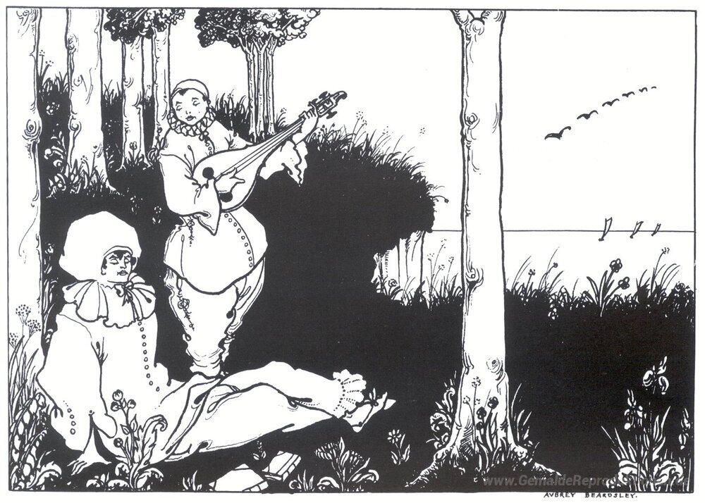 Wir bieten Ihnen eine handgefertigte Reproduktion auf Leinwand des berühmten Kunstwerks 'Design für Vorsatzpapier von 'Pierrot'' von Aubrey Beardsley, aus dem Reproduktionsmuseum.