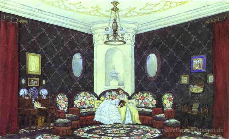 Wir bieten Ihnen eine handgefertigte Reproduktion auf Leinwand des berühmten Kunstwerks 'Die Blue Lounge' von Mstislav Dobuzhinsky, aus dem Reproduktionsmuseum.